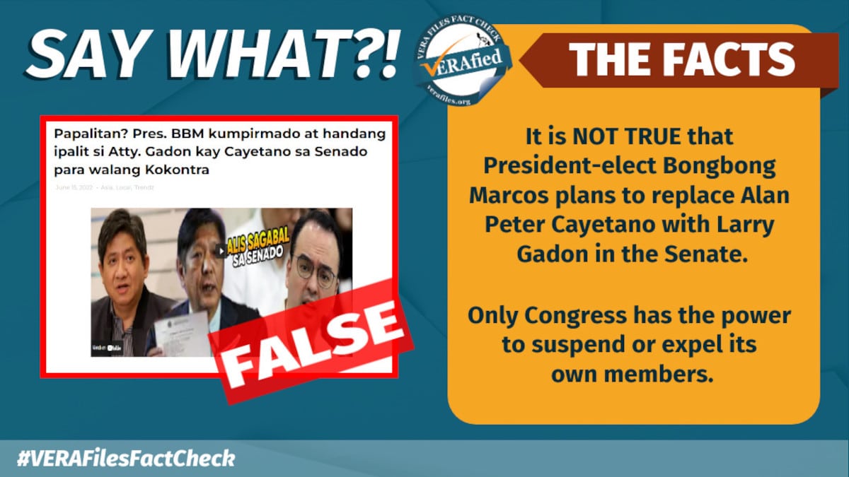 On June 15, an article was published that carried the headline: “Papalitan? Pres. BBM kumpirmado at handang ipalit si Atty. Gadon kay Cayetano sa Senado para walang kokontra (For replacement? President Marcos has confirmed and is preparing to substitute Atty. Gadon for Cayetano in the Senate so that no one will oppose [him])”