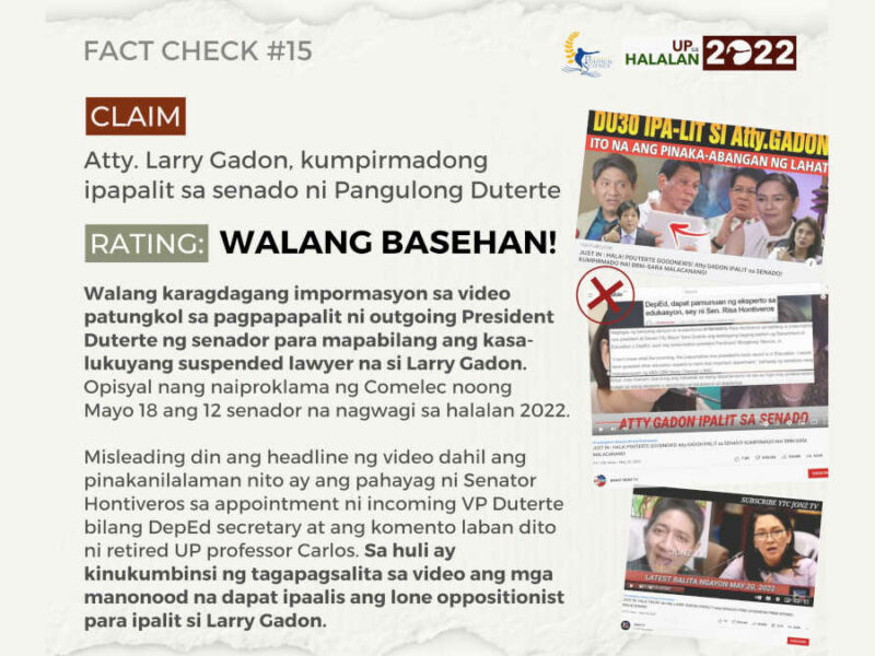 Gadon, who ran under the banner of Kilusang Bagong Lipunan, ranked 20th with 9,691,607 votes. It was his third failed senatorial bid in a row after losing the 2016 and 2019 senatorial races.
